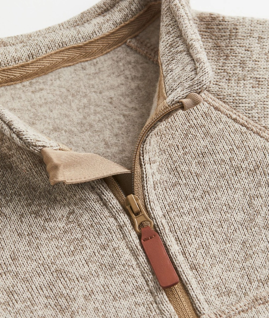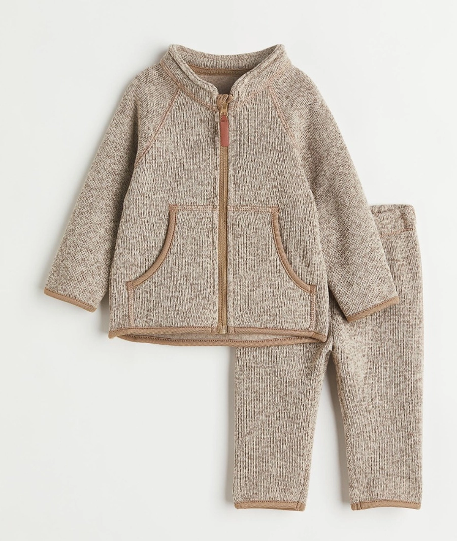 Set with a knitted jacket and pair of trousers lined with soft, thermal fleece. Jacket with a stand-up collar, zip down the front with a chin guard, long raglan sleeves and front pockets. Trousers with an elasticated waist.