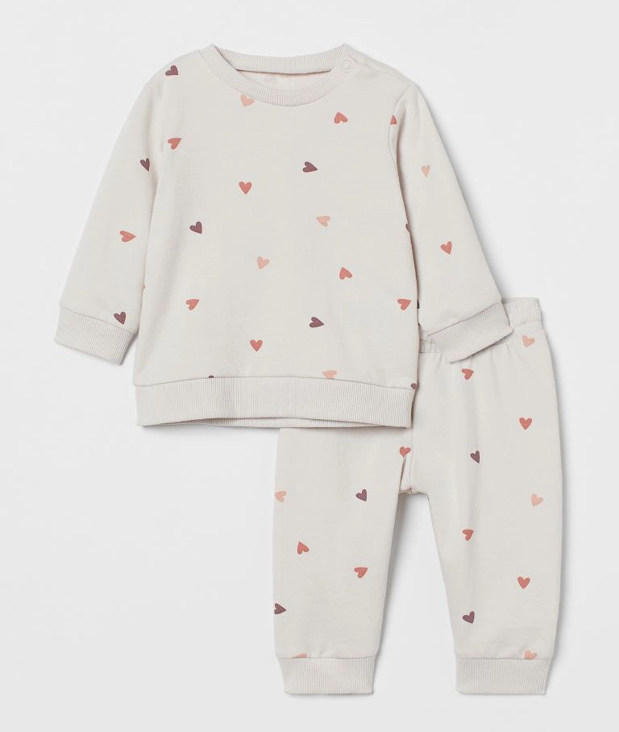 Set with a top and pair of trousers in soft, patterned organic cotton sweatshirt fabric. Top with long sleeves, ribbing around the neckline, cuffs and hem and a press-stud on one shoulder (except in sizes 1½-4Y). Trousers with an elasticated, drawstring waist and ribbed hems. Lightly brushed inside.