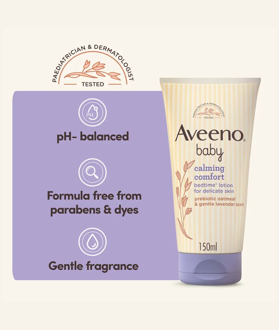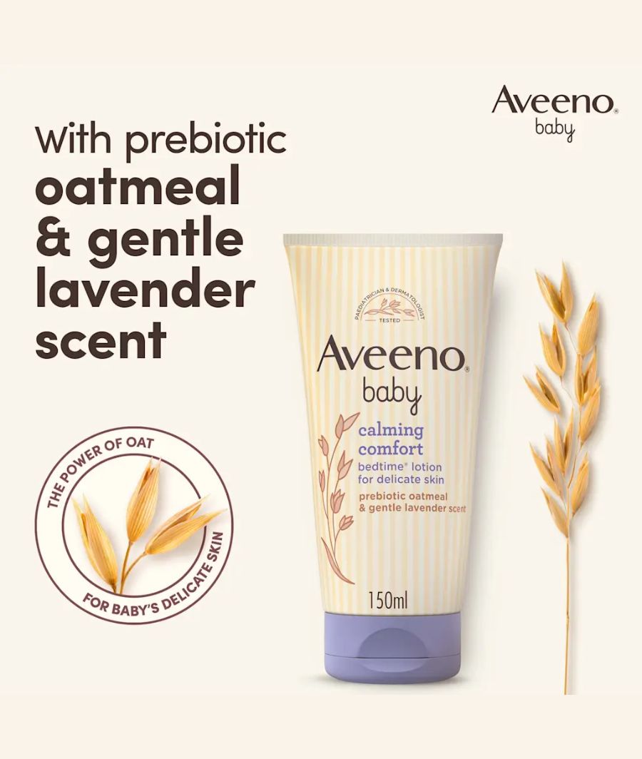 Formulated with Colloidal Oatmeal, a known prebiotic with the ability to support the growth of microorganisms naturally found in baby’s skin microbiome*, AVEENO Baby Calming Comfort™ Bedtime® Lotion helps protect your baby’s delicate skin, keeping it moisturised for 24 hours.