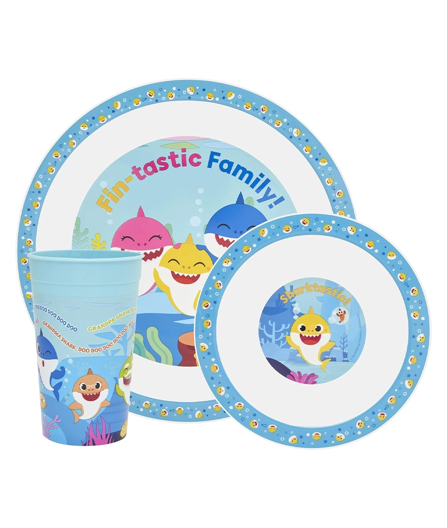 - Official Baby Shark Kids Dining Set: Our reusable Baby Shark kids plate, kids bowl and kids cup set is ideal for your little one. Matching cutlery set, lunch bag and water bottle are available as part of our official UK Baby Shark merchandise.