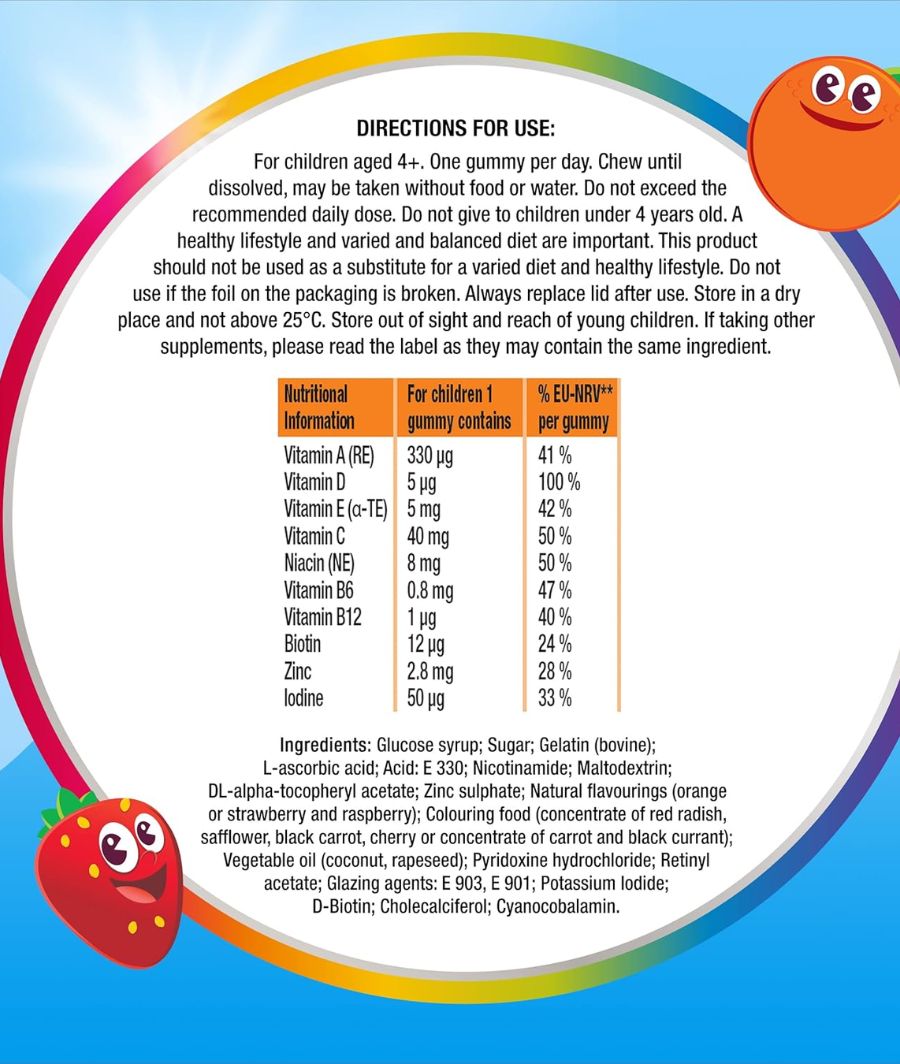 Glucose syrup, Sugar, Gelatin (bovine), L-ascorbic acid, Acid (E 330), Nicotinamide, Maltodextrin, DL-alpha-tocopheryl acetate, Zinc sulphate, Natural flavourings (0.25%) (orange or strawberry and raspberry), Colouring food (0.15%) (concentrate of red radish, safflower, cherry, black carrot, black currant), Vegetable oil (coconut, rapeseed), Pyridoxine hydrochloride, Retinyl acetate, Glazing agents (E 903, E 901), Potassium Iodide, D-Biotin, Cholecalciferol, Cyanocobalamin