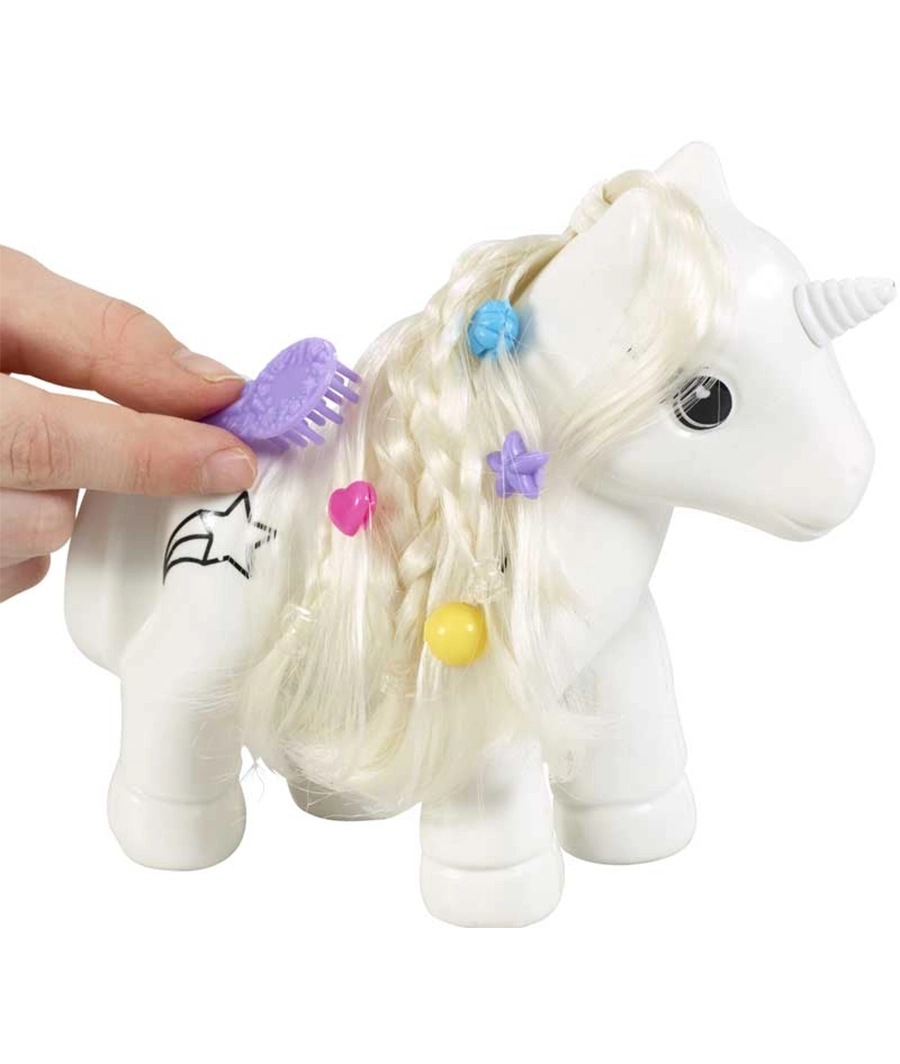 - Create patterns with the dry erase pens, then glam up its mane and tail using the brush and clip-on beads included