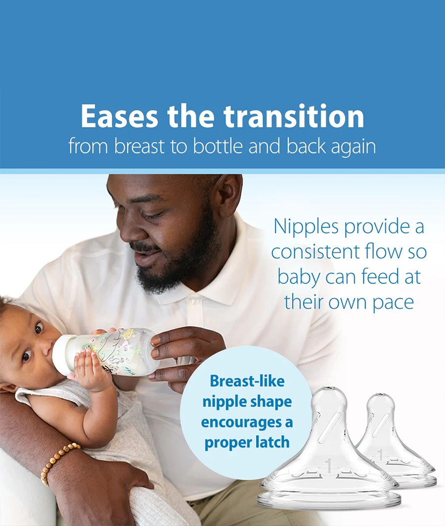 • Breast-like nipple shape encourages a proper latch and provides a consistent flow so babies feed at their own pace