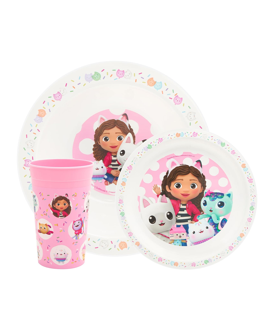 - Official Gabby’s Dollhouse tableware set: Our reusable Gabby’s Dollhouse plate, bowl and cup set is ideal for your little one. Matching cutlery set, lunch bag and water bottle are available as part of our official British Gabby’s Dollhouse merchandise.