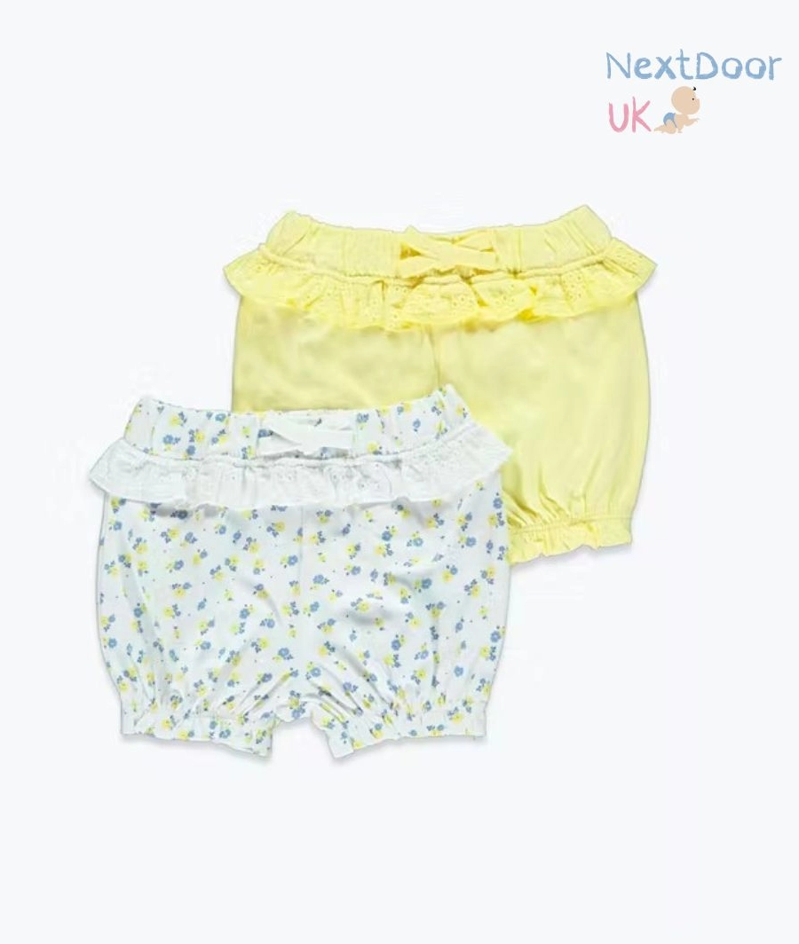Stock your little girl up on summertime essentials with this cute and comfy two-pack of shorts. Each crafted from soft and breathable 100% cotton, both pairs of shorts feature pretty frills and bow detailing, as well as stretchy elasticated waistbands and elasticated leg holes for maximum comfort. In plain yellow and floral designs, your young one is sure to look oh-so-cute when the sun comes out.