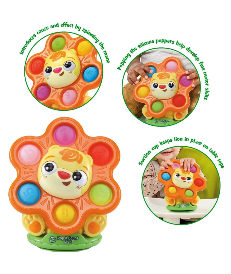 • CAUSE & EFFECT LEARNING: Spin the lion’s mane to see its googly eyes move, reinforcing cause and effect.