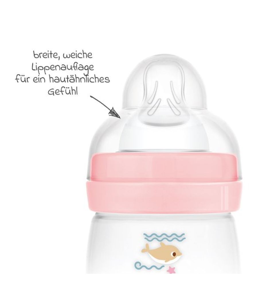In the early days after birth, many babies’ tummies hurt: too much air, flatulent foods in breast milk and a few other reasons can cause colic. To prevent this from happening to your little one, the MAM baby bottle is equipped with an anti-colic bottom valve. It enables an even flow so that your baby can drink in a relaxed manner from birth without swallowing air. The bottle with 1-hole teat is suitable for breast milk, formula, tea and water.