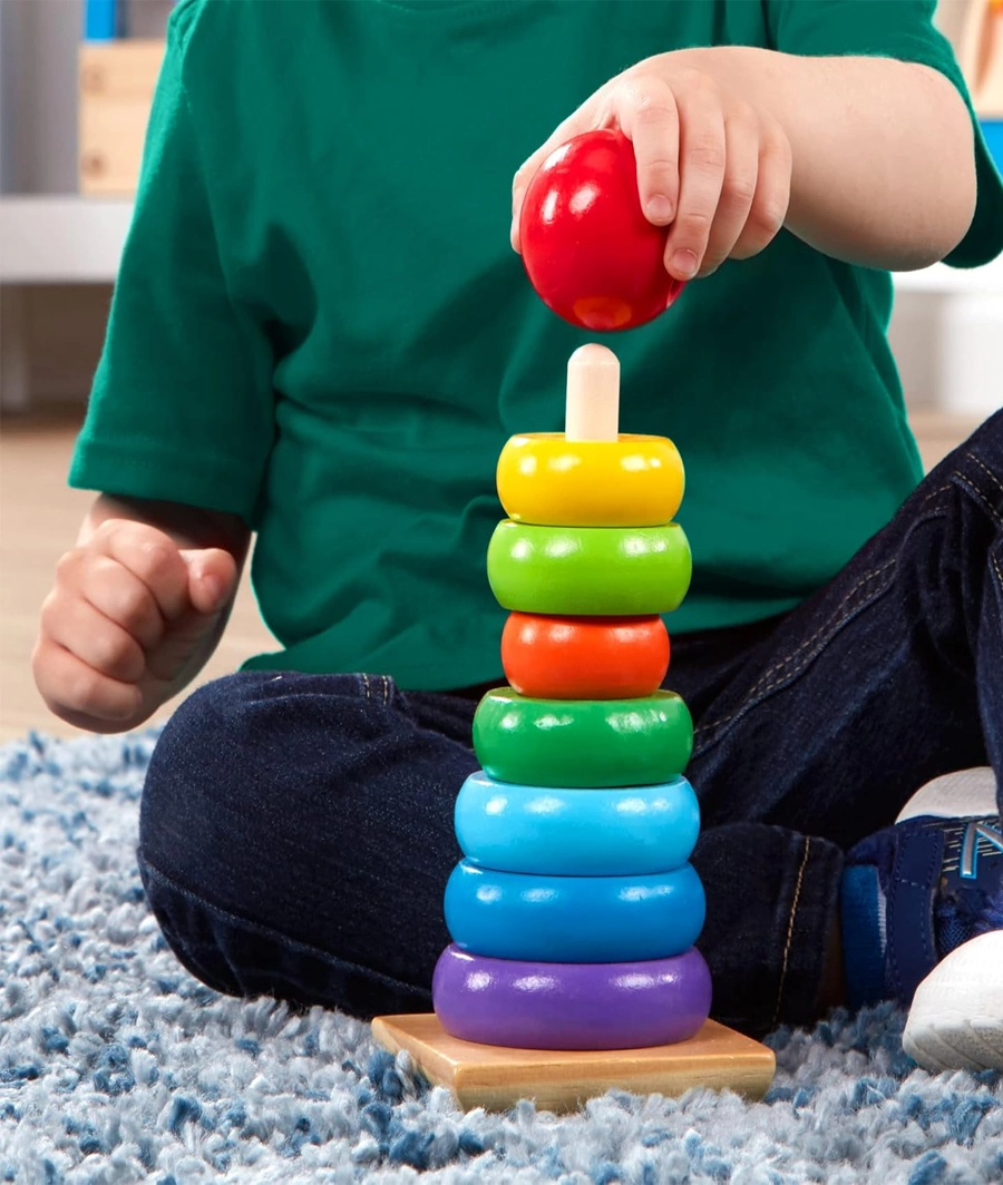 - Includes 7 brightly colored rings, a red topper piece, and solid wood rod on a rocking wooden base