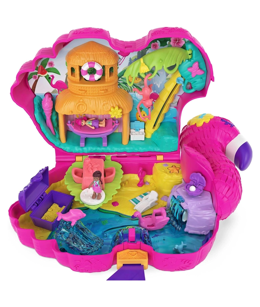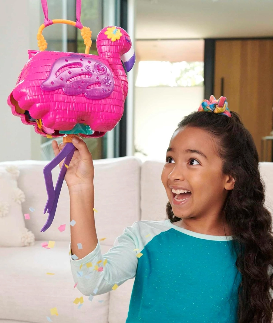 - It’s a tropical party with the Polly Pocket Flamingo Party playset! Get the party fun started by pulling the flamingo leg tabs and then watch the colourful stream of confetti and 26 surprises fall from the playset!