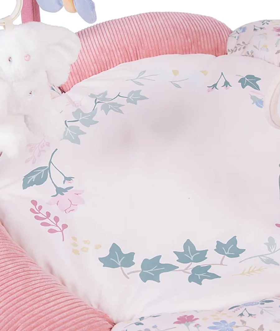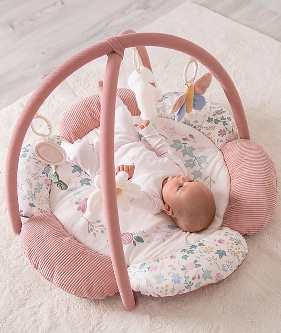 Padded Playgym that includes hidden squeakers and stimulating toys in the mat. Features a detachable toy bar and removable soft toys that include rattles and shakers.