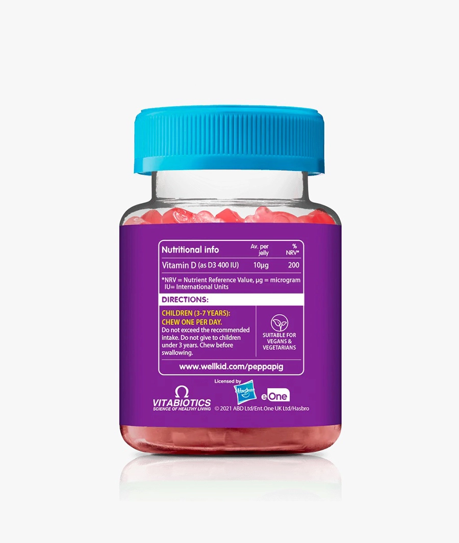 Wellkid Peppa Pig Vitamin D soft jellies are designed to support the health and development of children aged 3 to 7 years. Each jelly provides 10 micrograms (400 IU) of vitamin D3, the preferred form produced naturally by the body. Vitamin D is essential for normal growth and development of bones in children and contributes to the normal function of the immune system